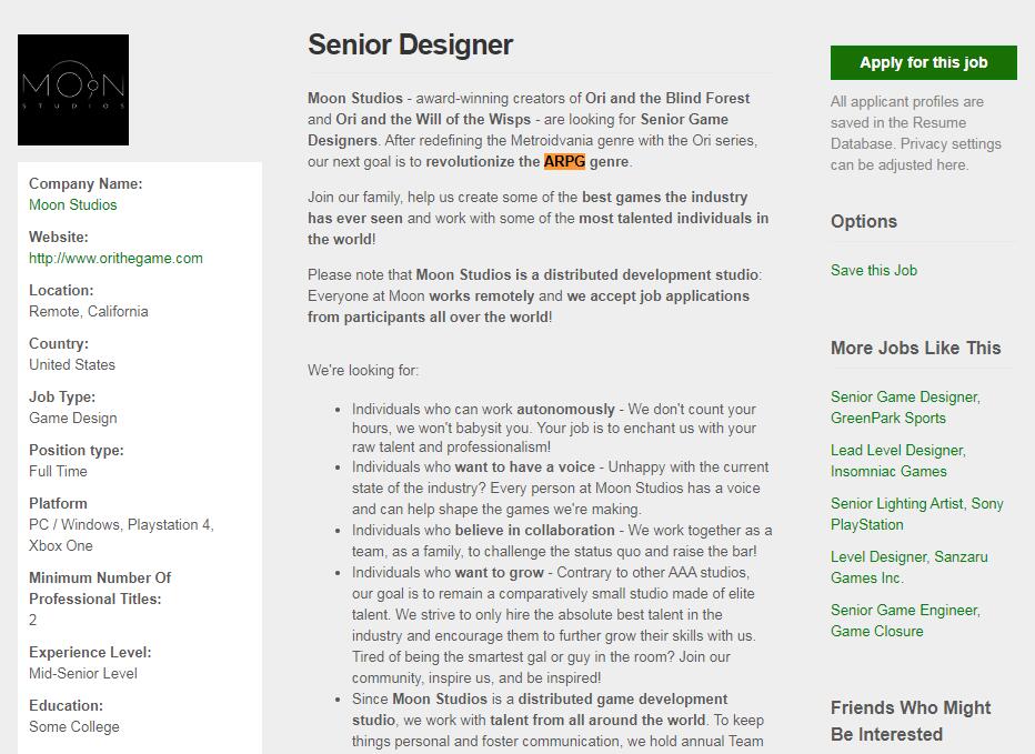 【《奥日》工作室正在开发一款动作RPG新作】《奥日》系列的工作室Moon Studio目前正在进行《奥日与精灵意志》的收尾工作。不过该工作室近日发布了一则招聘启事显示他们正在为一款动作RPG新作寻找高级设计师。工作室表示他们的目标是彻底革新动作RPG这种游戏类型,希望能够找到热爱像《暗黑破坏神》《塞尔达传说》《黑暗之魂》这类游戏的开发者。Moon Studio的下一款作品《奥日与精灵意志》将于2020年3月11日发售,而在这之后的动作RPG会给我们带来什么样的惊喜呢,让我们拭目以待。