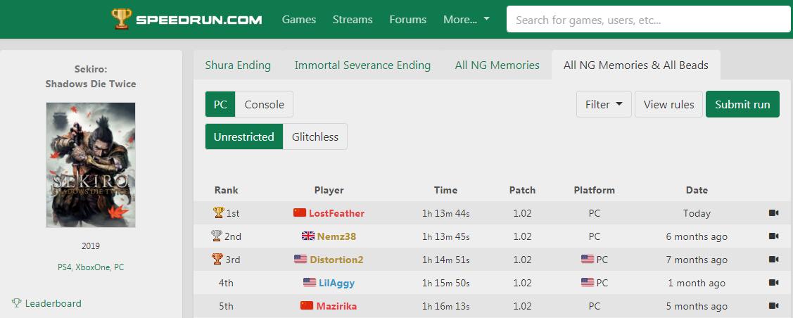 【国人破《只狼》速通纪录,一秒优势艰难夺冠】魂Like游戏一直是速通玩家们的热烈追捧的对象,今年TGA的年度游戏《只狼:影逝二度》更是如此。今日,来自国内的知名速通玩家“羽毛(LostFeather)”以1小时13分44秒的成绩,在全boss及全佛珠的条件下通关游戏,创造了新的世界纪录!而这与第二名“Nemz38”的成绩只相差了一秒,之前Nemz38的成绩排在榜单第一位已经有6月有余。由于《只狼》发售已经有一段时间,速通的玩法也已经开发的差不多了。因此这看似轻松的一秒,背后其实需要付出的大量的心血练习,着实不易,让我们一起祝贺羽毛!
