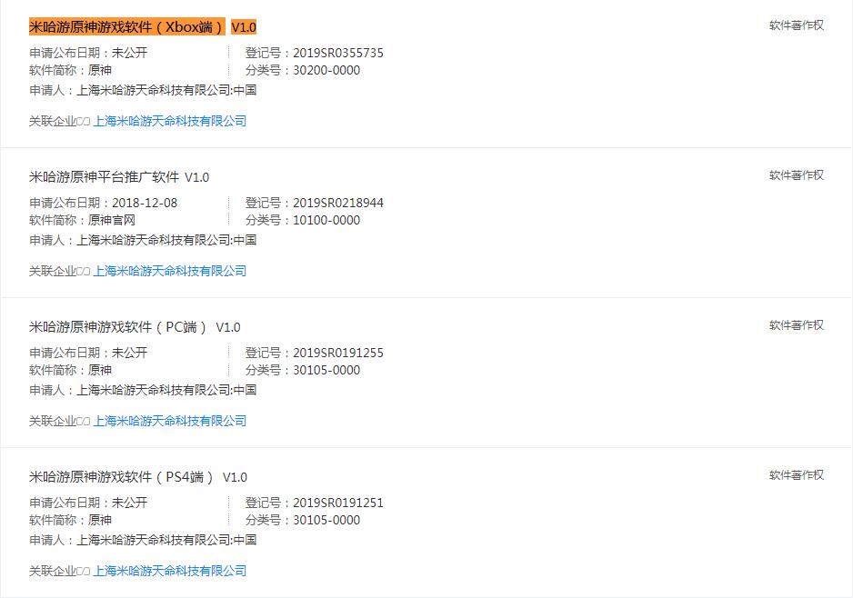 【《原神》或将登陆Xbox平台】天眼查信息显示,米哈游已经申请了《原神》Xbox端的软件著作权。此项信息表示,游戏在宣布登陆PS4、PC、Switch以及手机后,有可能还会登陆Xbox One平台。