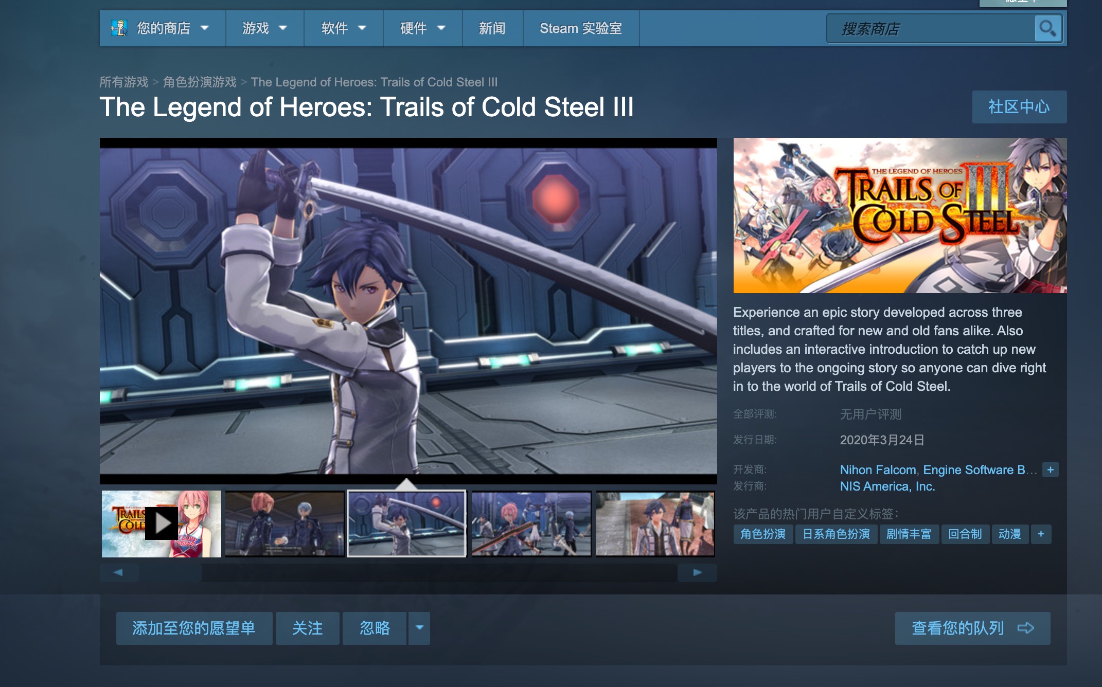 【《英雄传说:闪之轨迹3》登陆PC平台】Falcom今日宣布,《英雄传说:闪之轨迹3》将在3月24日登陆Steam、GOG平台,不过尚未支持中文。在3月30日之前购买还可获得服装奖励。游戏最初在2017年9月登陆PS4平台。