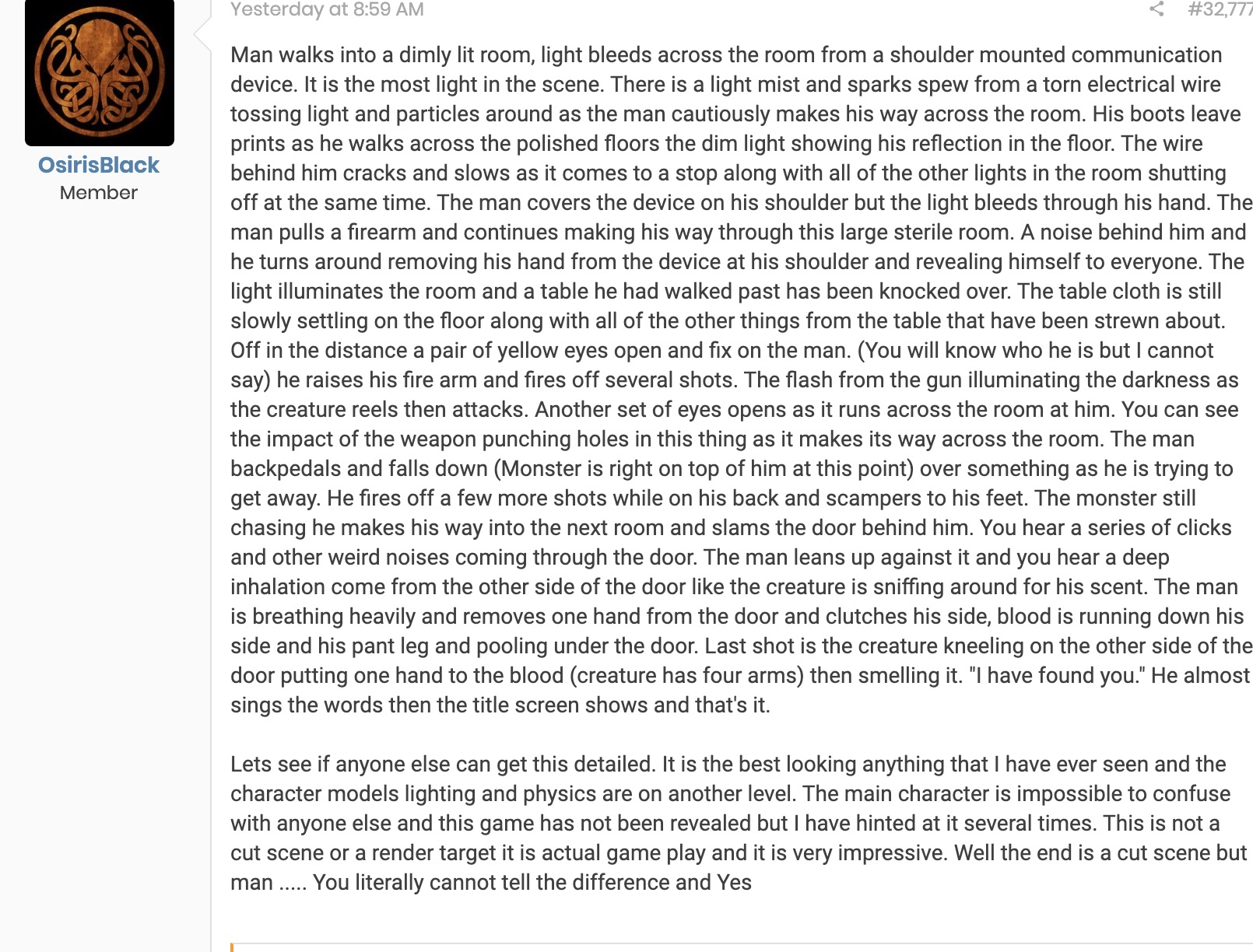 【网曝某次世代新作预告细节,疑为《教团1886》续作】PS5到底会有多少护航游戏?这无疑是我们关心的一点,此前《教团1886》开发商Ready At Dawn表示在开发新的3A游戏,但是否是《教团1886》续作也无人可知。近日,NeoGAF用户OsirisBlack在一个帖子中描述了自己亲眼所见的一部次世代主机新作预告片。大致的内容为:“他的肩膀上装有照明装置,在暗淡的房间中观察的过程中遭遇了黄色眼睛的多臂生物,他朝着怪物射击并逃离了现场。那怪物从门后嘲笑着他,并唱着说‘我找到了你’。”根据该用户的描述,这些内容都是实机画面而不是CG,并且光照和物理技术均为“另一层次”。外媒Gamesradar通过此内容推测这是《教团1886》新作的预告片。尽管从描述来看有那么些Feel,不过我们仍无法就此断定会是哪款游戏。一切还需以官方消息为准。