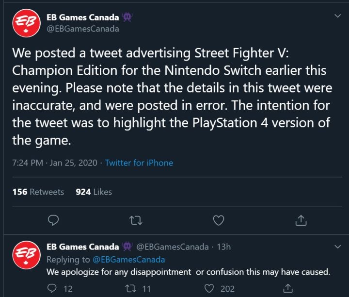 【临时工操作,EB Games澄清并没有Switch版《街霸5》】昨天我们报道了游戏零售商EB Games发布消息称《街头霸王5:冠军版》将在下个月登陆Switch平台,并且已经开启了预定。今天EB Games就发文澄清表示昨天的消息系他们发布失误,Switch版原本指的是PS4平台:“我们之前曾发布了一条Switch版《街头霸王5:冠军版》的推文,请注意这条推文信息不准确,其原本目的是想强调PS4版游戏,对此造成的玩家失望和困惑,我们深表歉意。”