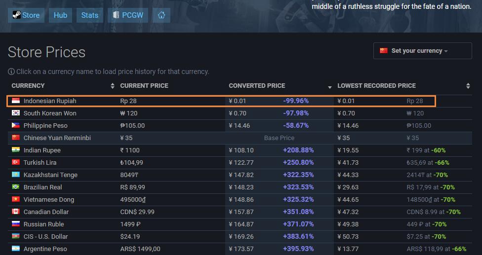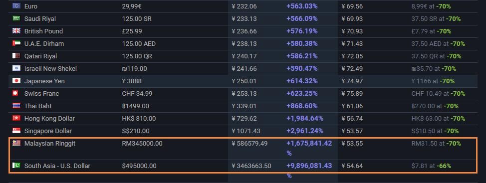 【Steam《刺客信条:大革命》各区价格异常,最高346万最低仅需1分钱】Steam上的《刺客信条:大革命》今日似乎出现了定价异常的情况。根据SteamDB查询数据,游戏在印尼区的售价为28卢比(约0.01元),而在马来西亚区的售价却为34.5万令吉(约58万元),更夸张的是南亚区的售价,达到了骇人的49.5万美元(约346万)。