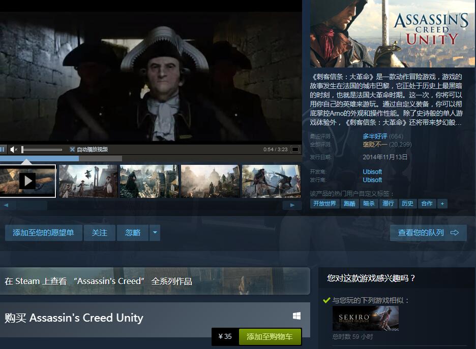此外,游戏在国区的价格也出现了异常,游戏目前售价是没有打折的正常价格35元,但其实35元已经是-70%以后的史低价。本次定价异常究竟是系统错误还是“临时工”,育碧官方暂未作出回复。