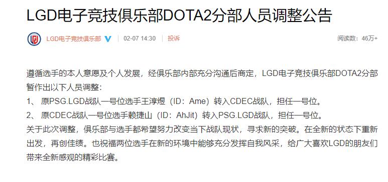 【一号位互换!《DOTA2》LGD战队官宣Ame转会CDEC】根据LGD俱乐部官方微博消息,原《DOTA2》PSG.LGD战队一号位选手王淳煜(ID:Ame)将转入CDEC战队,担任一号位,原CDEC战队一号位选手赖捷山(ID:AhJit)转入PSG.LGD战队,担任一号位。