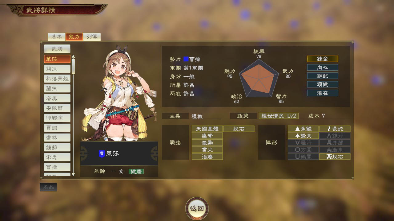 《莱莎的工作室》则分别有“莱莎”、“科洛蒂娅”、“兰托”、“塔奥”、“莉拉”、“安佩尔”6名角色作为原创武将在《三国志14》登场。