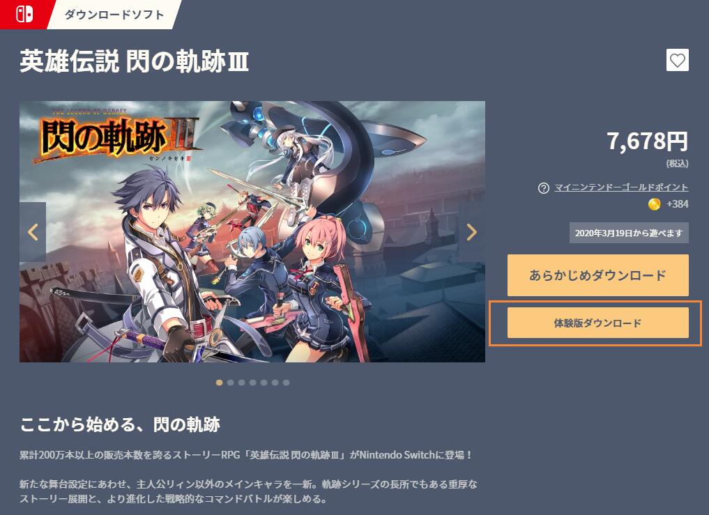 【Switch《闪之轨迹3》试玩版上架】任天堂eShop JP今日上架了Switch《英雄传说:闪之轨迹3》的试玩体验版。体验版大小为6.7GB,暂时只支持日文。《闪之轨迹3》将于3月19日登陆Switch,售价7,678日元(约519元),暂时不清楚未来是否会推出中文。