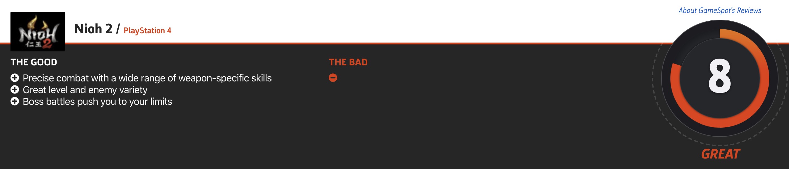 【《仁王2》Gamespot评分8分:向死而生】Gamespot今日为《仁王2》打出了8分的不错评价。Gamespot认为,《仁王2》的难度甚至比初代还要大,在你的技术到位之前,你可能会“落命”多次。游戏的战斗系统十分精细,并且伴随着多种多样的武器和技能;在关卡和Boss战上,《仁王2》的多样性让你不会感到无聊,并且Boss战会将你的游戏潜能逼到极限。目前《仁王2》已经在PS4平台正式发售。