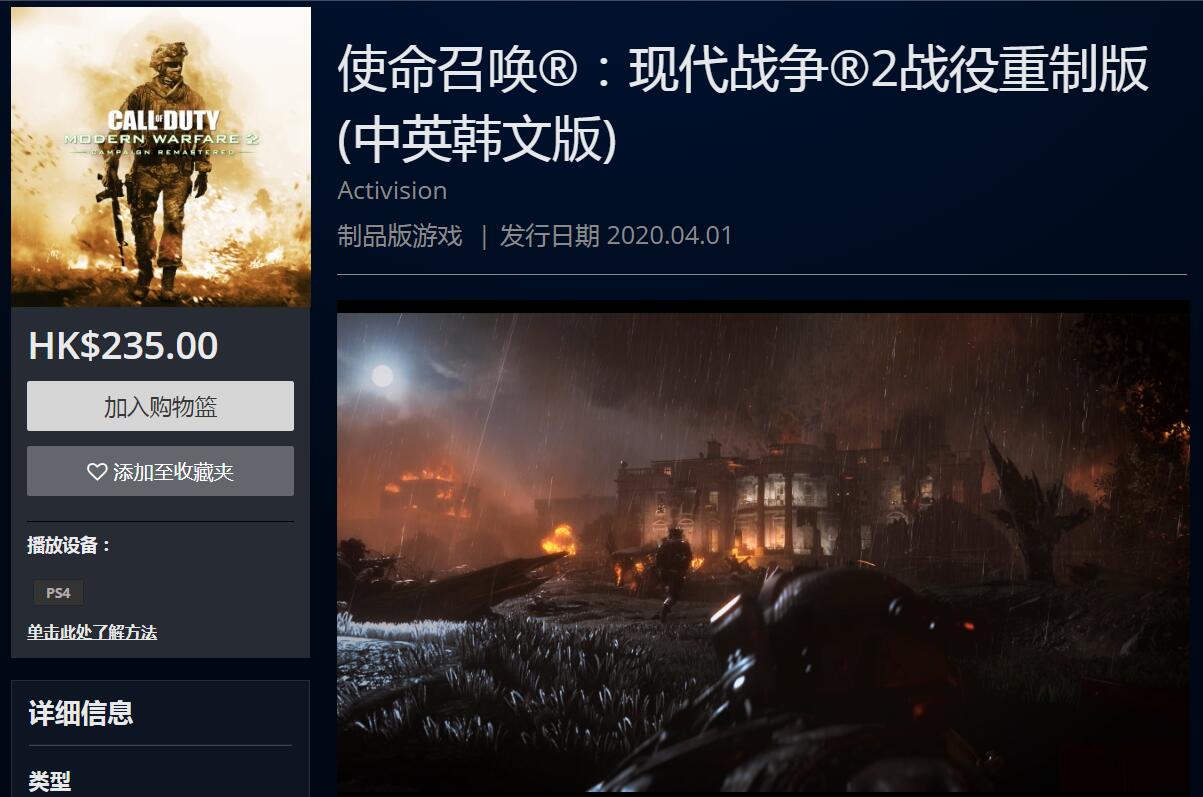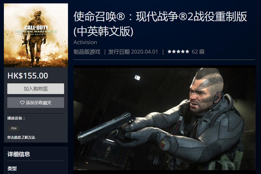 PSN HK商店调整《COD现代战争2 战役重制版》售价,已降至155HKD