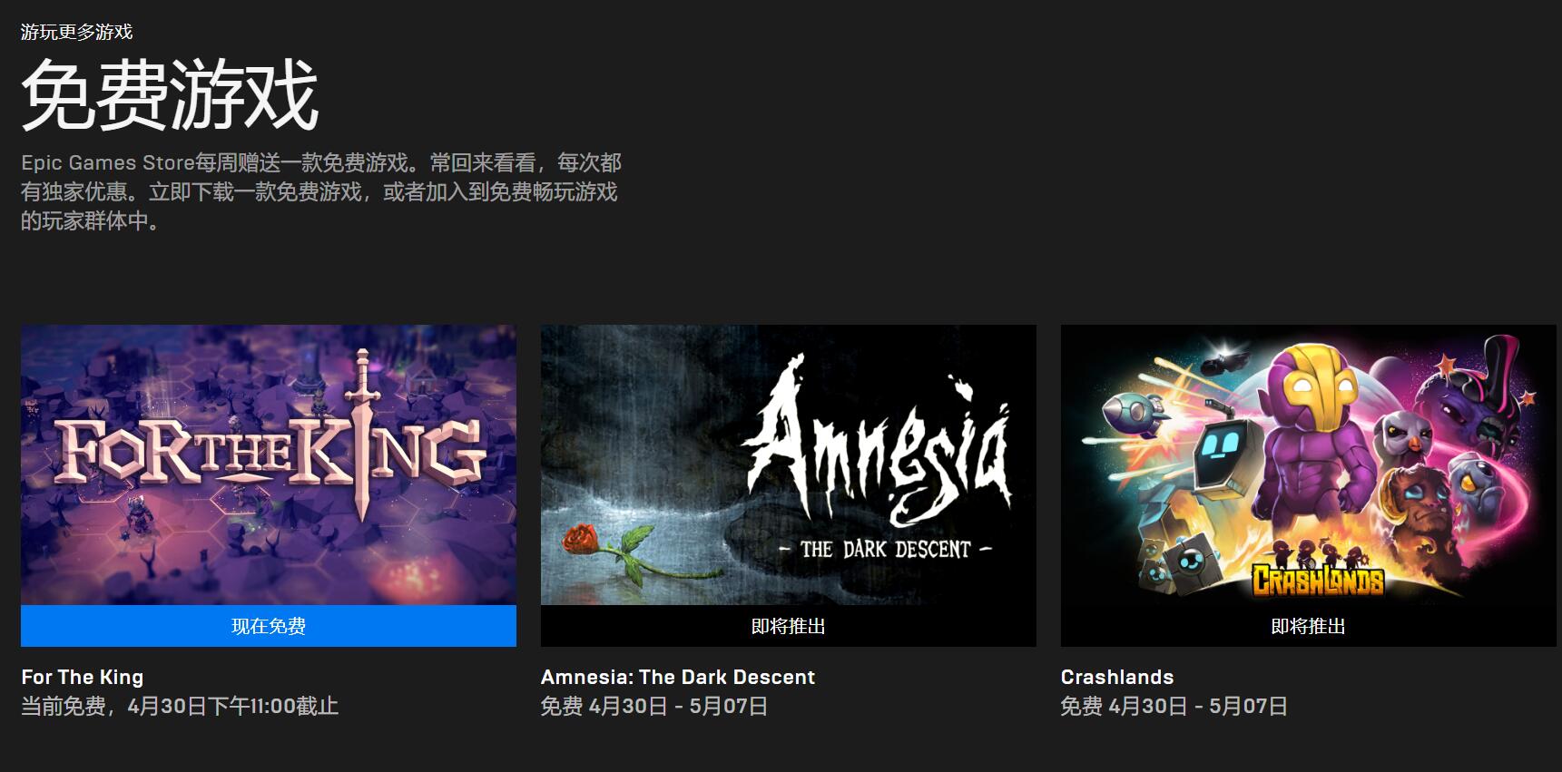 Epic本周免费游戏《为了吾王》已可领取,下周免费游戏《失忆症:黑暗后裔》和《崩溃大陆》