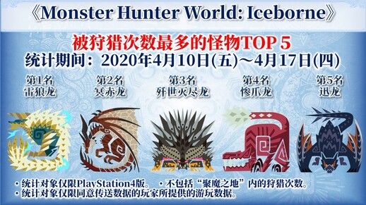 【Capcom公布《怪猎世界 冰原》被狩猎次数最多怪物Top5】Capcom公布了《怪猎世界 冰原》PS4版上被狩猎次数最多的怪物Top5,依次为:雷狼龙、冥赤龙、歼世灭尽龙、惨爪龙、迅龙。PS:此次排名统计时间为4月10日~4月17日,不包括“聚魔之地”的狩猎次数。