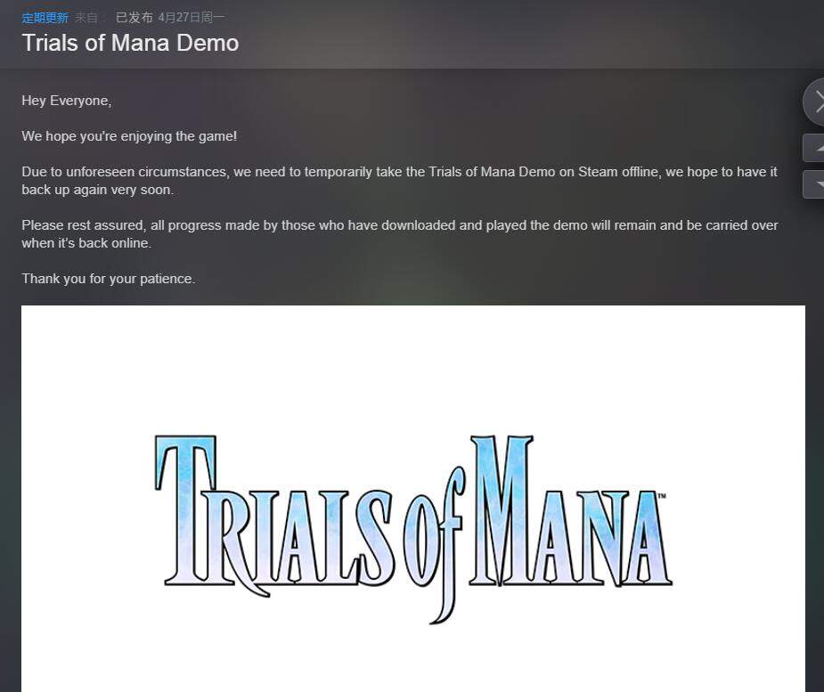 【SE暂时下架Steam《圣剑传说3 重制版》体验DEMO】《圣剑传说3 重制版》Steam页面发布公告表示将暂时下架体验版DEMO,DEMO将在调整完成后再重新上架。虽然公告中并未提及暂时下架体验版DEMO的具体原因,但从公告下方的玩家评论来看,原因或许是因为之前的有玩家通过绕过DEMO的漏洞直接游玩到正式版的内容。