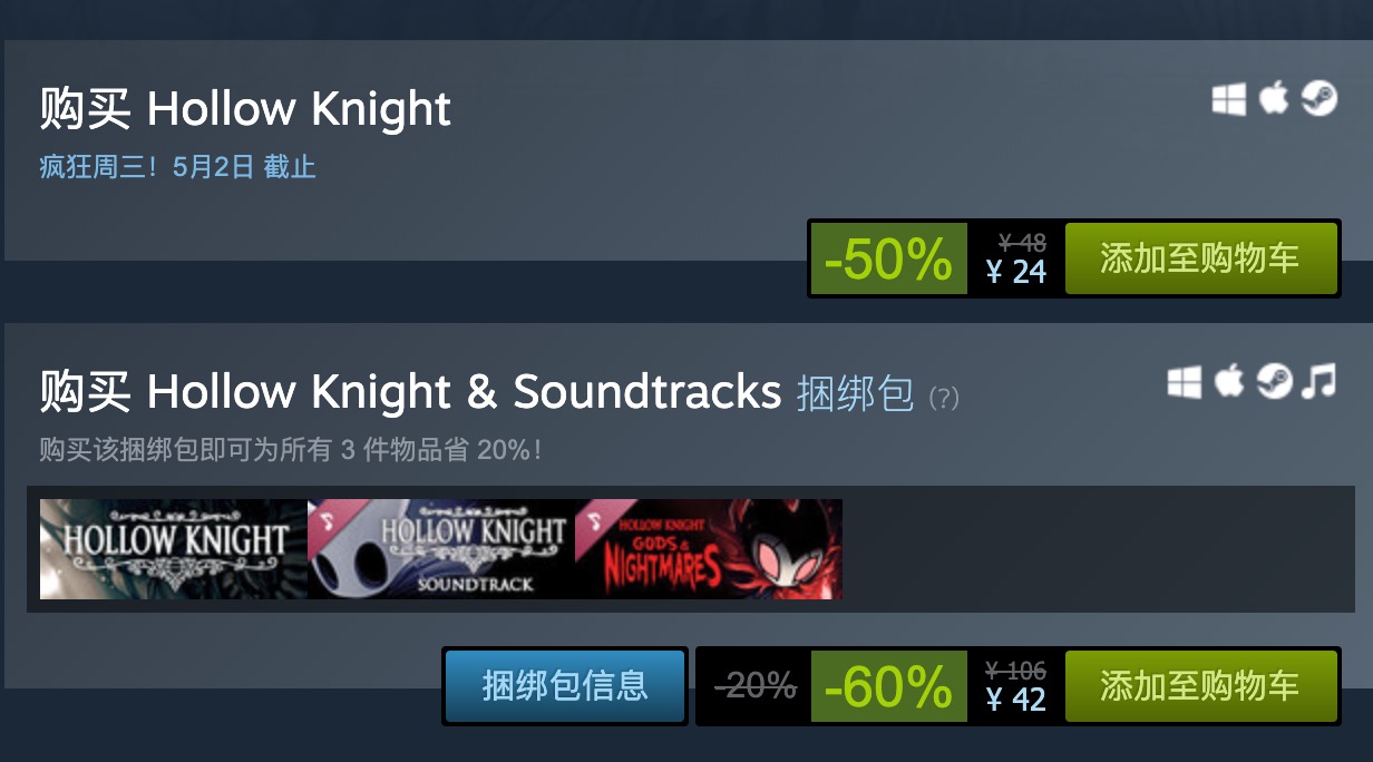 【Steam疯狂周三:《空洞骑士》特惠24元平史低】Steam平台今日又开启了疯狂周三特惠活动。其中《空洞骑士》现以24元(-50%)平史低的优惠价促销。优惠截止至5月2日。《空洞骑士》是一款传统风格的 2D 动作冒险游戏,庞大的游戏世界交错相通。探索幽深的洞穴、古老的城市和危险的废墟,与被感染的生物战斗,结识友好又奇异的昆虫,并且深入王国腹地,揭开远古谜团的真相。Steam好评率目前高达97%。