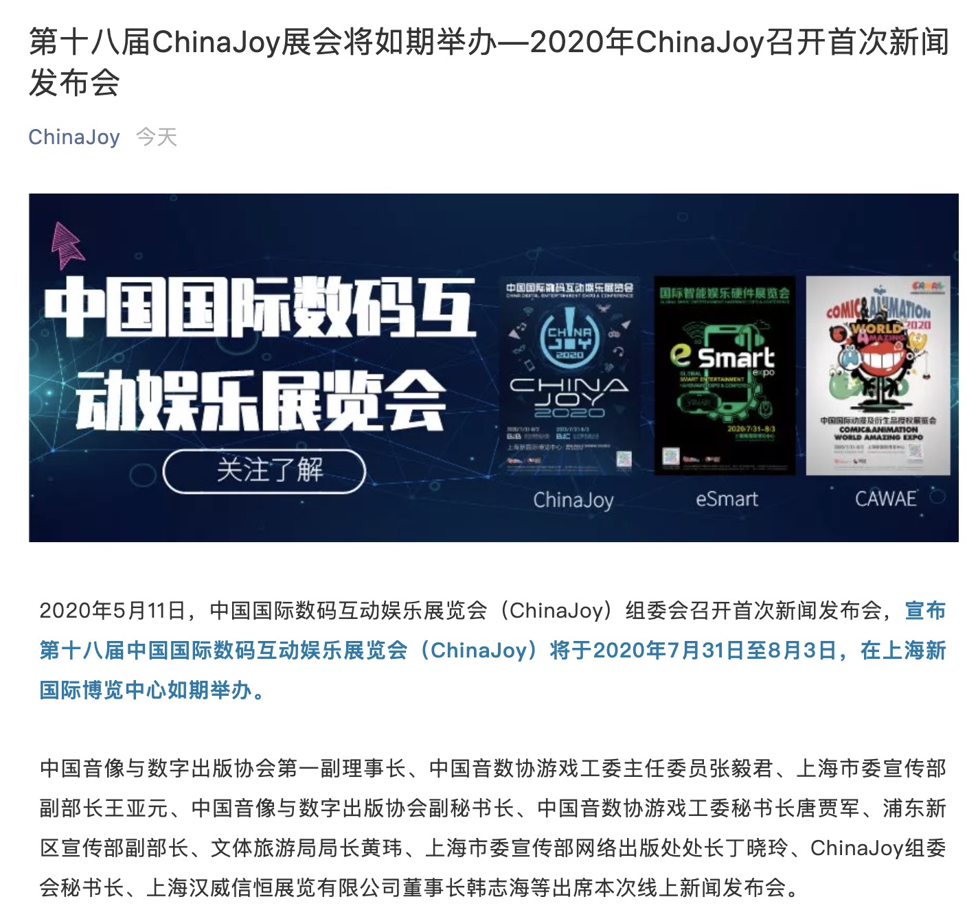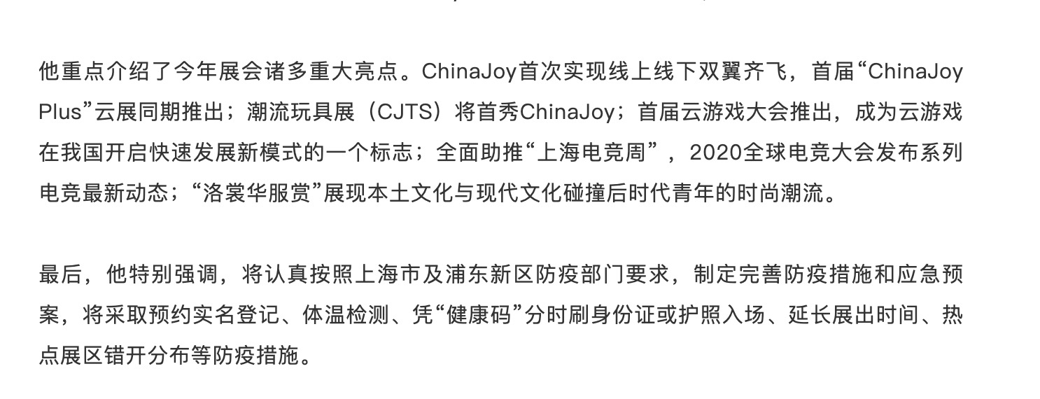 2020年ChinaJoy将于7月31日-8月3日如期举行