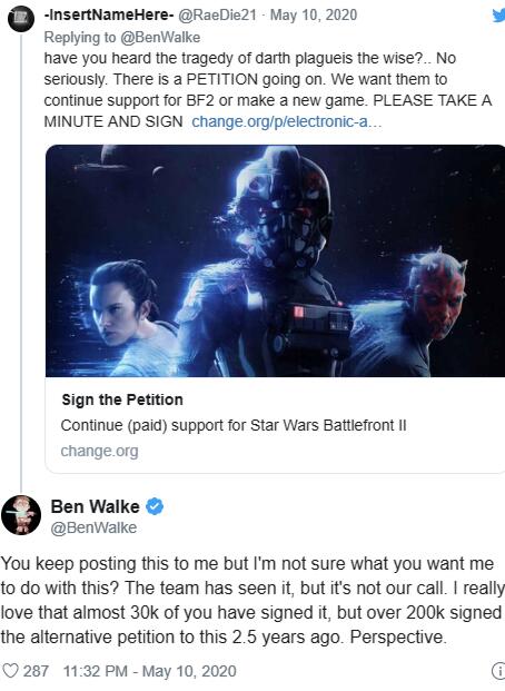 DICE工作室曾经表示,在今年4月底推出更新后,《星球大战:前线2》将不会有后续新内容推出。但超过五万名玩家在Change网站上发出请愿书,希望官方能够继续更新游戏。请愿书上称:《星球大战:前线2》是一款游戏史上“浪子回头”的典型案例,虽然首发后它的口碑一路走低,但官方给与的一系列转变拯救了这个游戏。可惜现在官方已经停止了后续支持,但这款游戏仍旧潜力无穷。粉丝们希望能够继续获得新地图、新英雄以及皮肤,并且愿意付费支持。随后DICE制作人Ben Walke对此做出回应,表示团队已经收到玩家的意见,但是这不是制作团队所能决定的。此外他还暗示请愿人数多不一定能带来成功的回应。