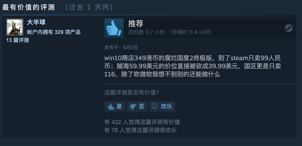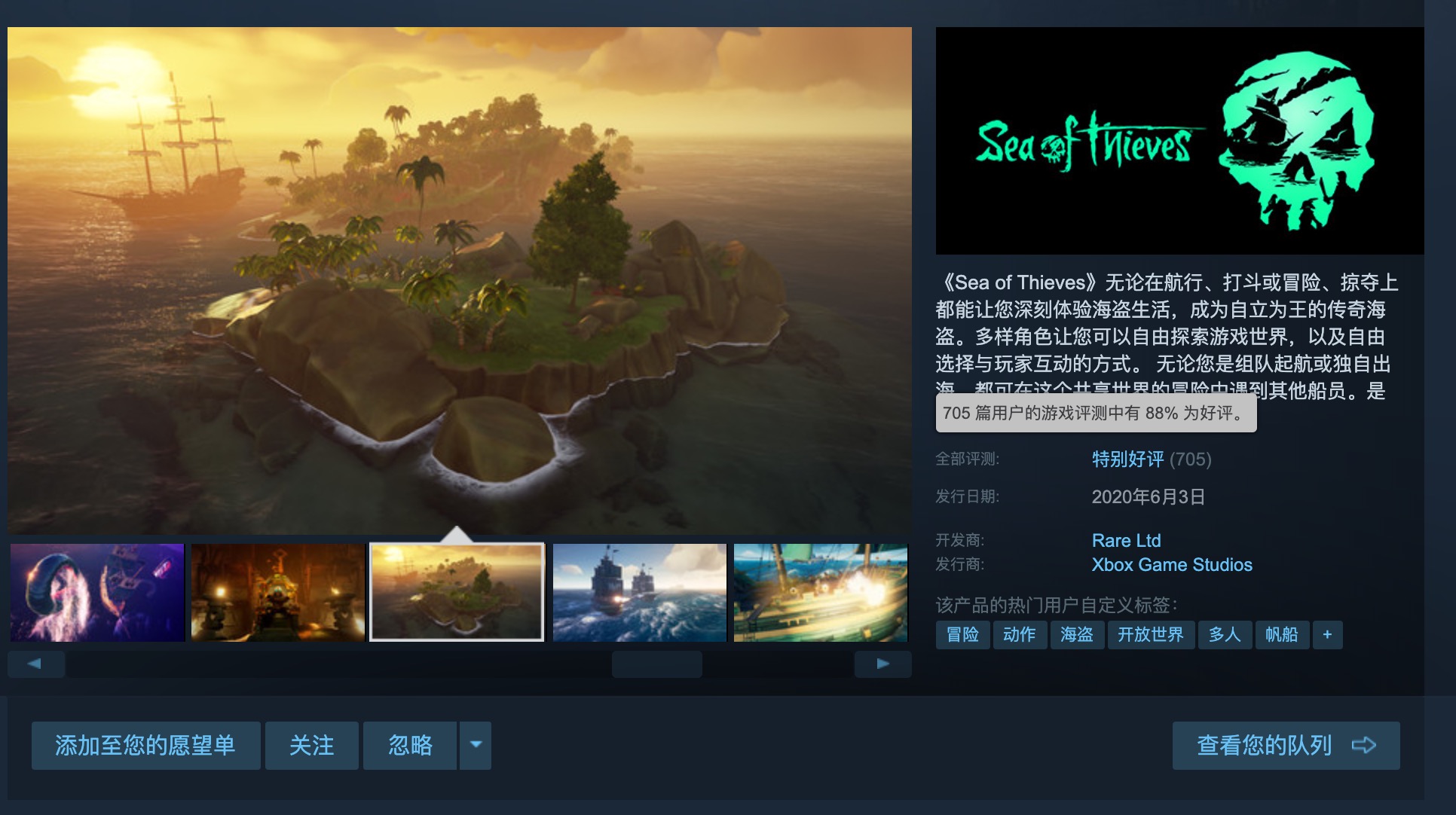 【《盗贼之海》Steam首日特别好评:售价良心,品质优秀】《盗贼之海》此前已经在2018年登陆Xbox One平台,而昨天游戏也已经正式登陆Steam平台,支持中文。售价116元。目前游戏的评价为“特别好评”,有88%的玩家为游戏打出了好评。有玩家表示Steam版的《盗贼之海》定价良心,116元的售价相当实惠;也有玩家的表示对游戏期待已久,而质量也确实“真香”。《盗贼之海》是一款无论在航行、打斗或冒险、掠夺上都能让你深刻体验海盗生活的游戏。游戏拥有2条故事线共11篇故事,战役时长达30小时。