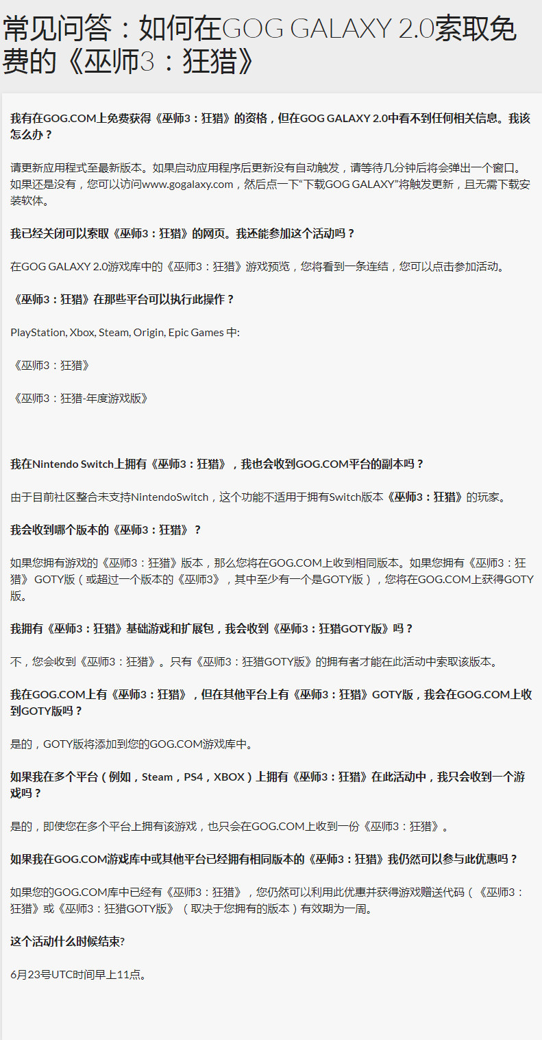 【在其他平台购买过《巫师3》的玩家可免费获取GOG版】CD PROJEKT旗下GOG游戏平台宣布,在其他平台购买过《巫师3》的玩家,于GOG GALAXY 2.0上连接过该平台后,即可免费获得GOG版本的《巫师3》。游戏的版本和之前购买的一致,若其中有一个版本为年度版,GOG上获得的游戏也会变成年度版。该活动目前支持PS4、Xbox One以及PC平台(Switch平台因为还未整合所以暂不支持),免费领取的活动截止至6月23日。详细内容可见配图Q&A。
