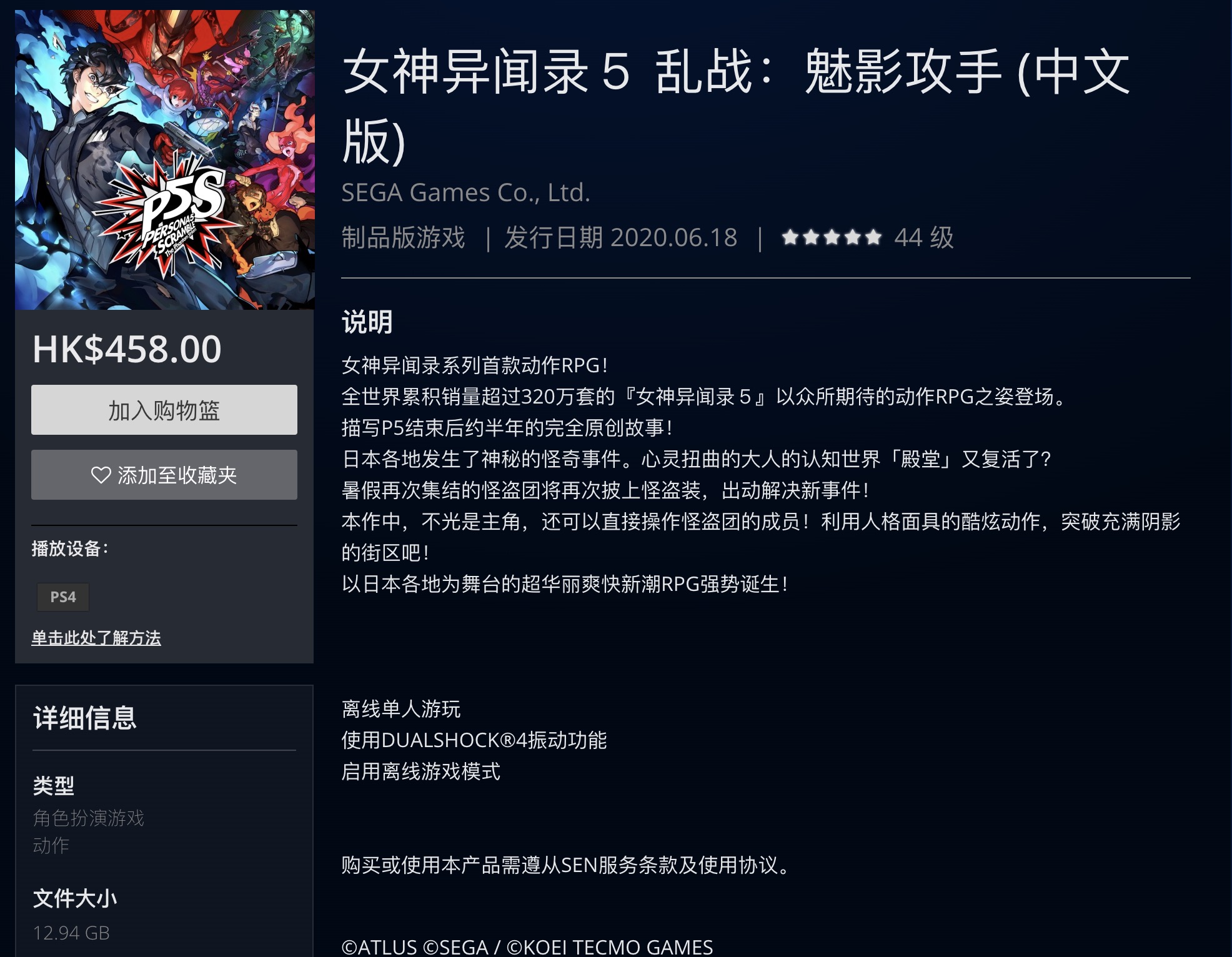PSN HK上架《女神异闻录5S》中文版,售价458HKD