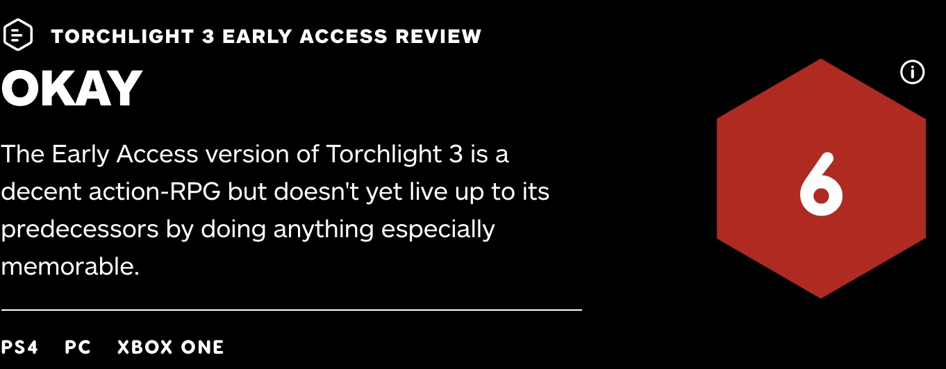 【《火炬之光3》EA测试版IGN评测6分:还有很多提高空间】IGN今日为《火炬之光3》的EA抢先体验版打出了6分的评价。IGN认为,《火炬之光3》当前的版本就像是一道ARPG快餐,在几乎所有方面都是“可以接受”的评级。不过与竞争对手相比,它并不是难忘的、具有革命性的。或许随着时间的推移,游戏将会更加完善,产生一些亮点,但就现在而言,游戏并没有许多独特的地方。从地牢体验到搜刮体验,游戏还有非常多的地方能够做得更好。