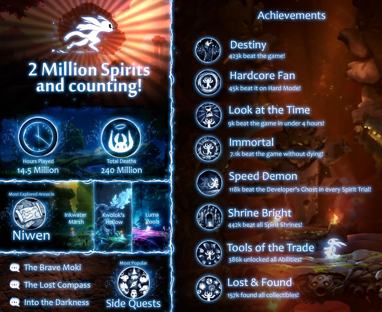 【《精灵与萤火意志》游玩人数突破200万,有7100名玩家一命通关游戏】Moon Studios确认《精灵与萤火意志》游玩玩家人数突破200万,同时还公布了一组游戏数据,例如有42.3万名玩家通关了游戏,其中有4.5万名玩家以困难模式通关,9000名玩家仅在4小时内就完成了通关,7100名玩家一命通关游戏!