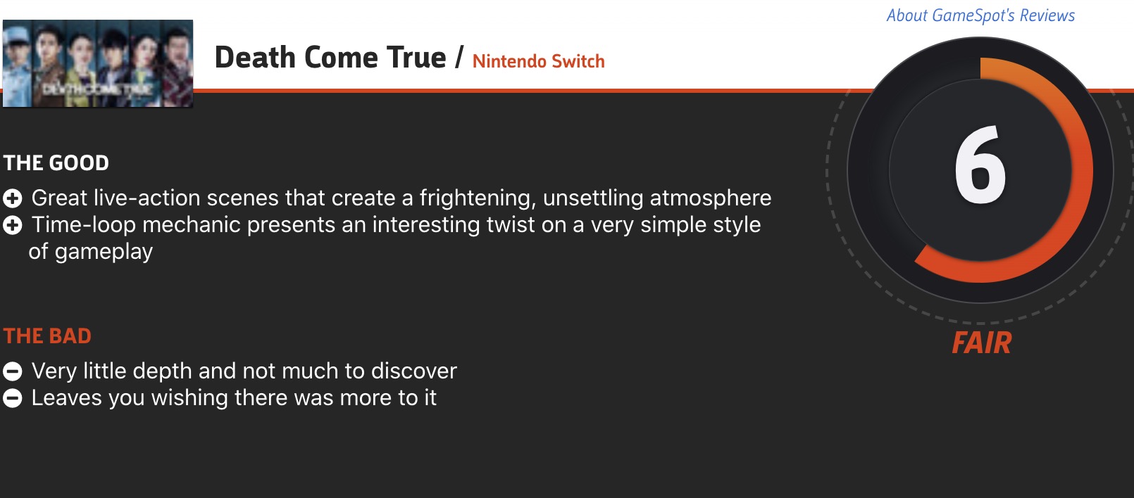 【小高和刚悬疑推理新作《终结降临》Gamespot 6分】Gamespot今日为小高和刚推理悬疑新作《终结降临》打出了6分的评价。Gamespot认为,《终结降临》作为真人剧,其精彩的真人演出成功营造出了惊悚不安的氛围,时间循环机制也为简单的游戏风格带来了有趣的转折。不过缺点是游戏的深度不够,探索要素不多,并且在玩家想要了解更多的时候总有种戛然而止之感。