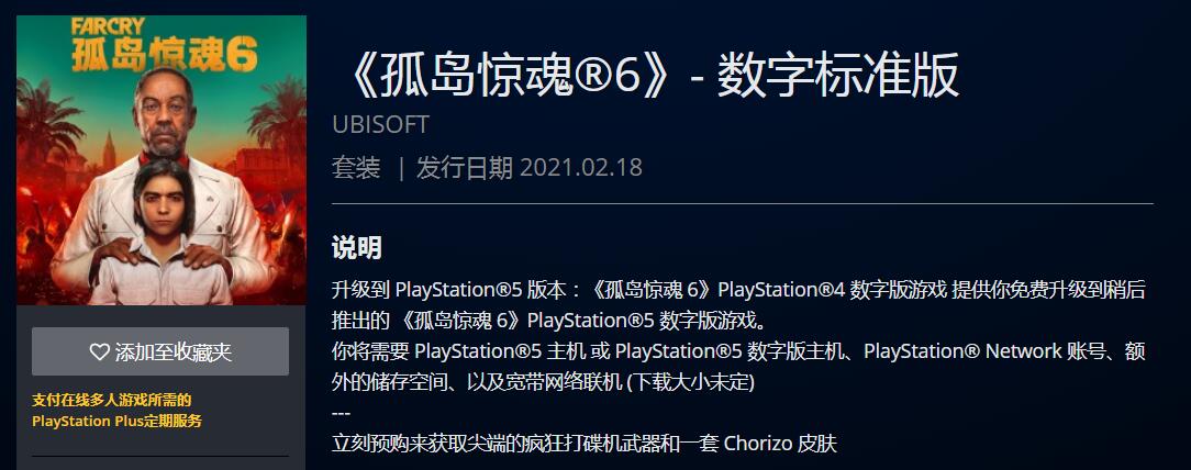 【PS4版《孤岛惊魂6》提前泄露,明年2月18日发售,可免费升级为PS5版】PSN HK商店提前泄露了《孤岛惊魂6》PS4版游戏页面,据悉页面显示游戏将在2021年2月18日发售,支持免费升级为PS5版。《孤岛惊魂6》包含单人与多人游玩模式,并将带来迄今为止“孤岛惊魂”系列最大的游戏世界。