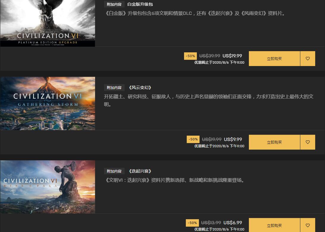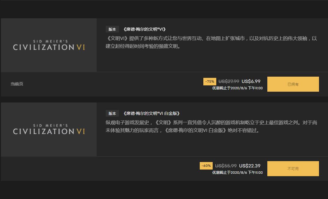 【Epic《文明6》低价折扣,标准版2.5折仅售6.99美元】Epic平台上目前正在进行《文明6》的低价促销。标准版2.5折超低价仅售6.99美元。包含6款DLC以及两部资料片的白金版4折特惠售价22.39美元。如果你已经在之前的周免活动中领取了本体,想要进行升级。也可以购买游戏的白金版升级包,5折19.99美元。此外,风云变幻以及迭起兴衰两部资料片也在进行单独的特惠,分别售价9.99美元以及6.99美元。折扣截止至8月6日。