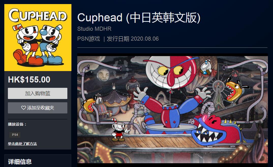 MDHR工作室旗下横版动作游戏《茶杯头历险记》现已登陆PSN HK商店,售价155HKD。