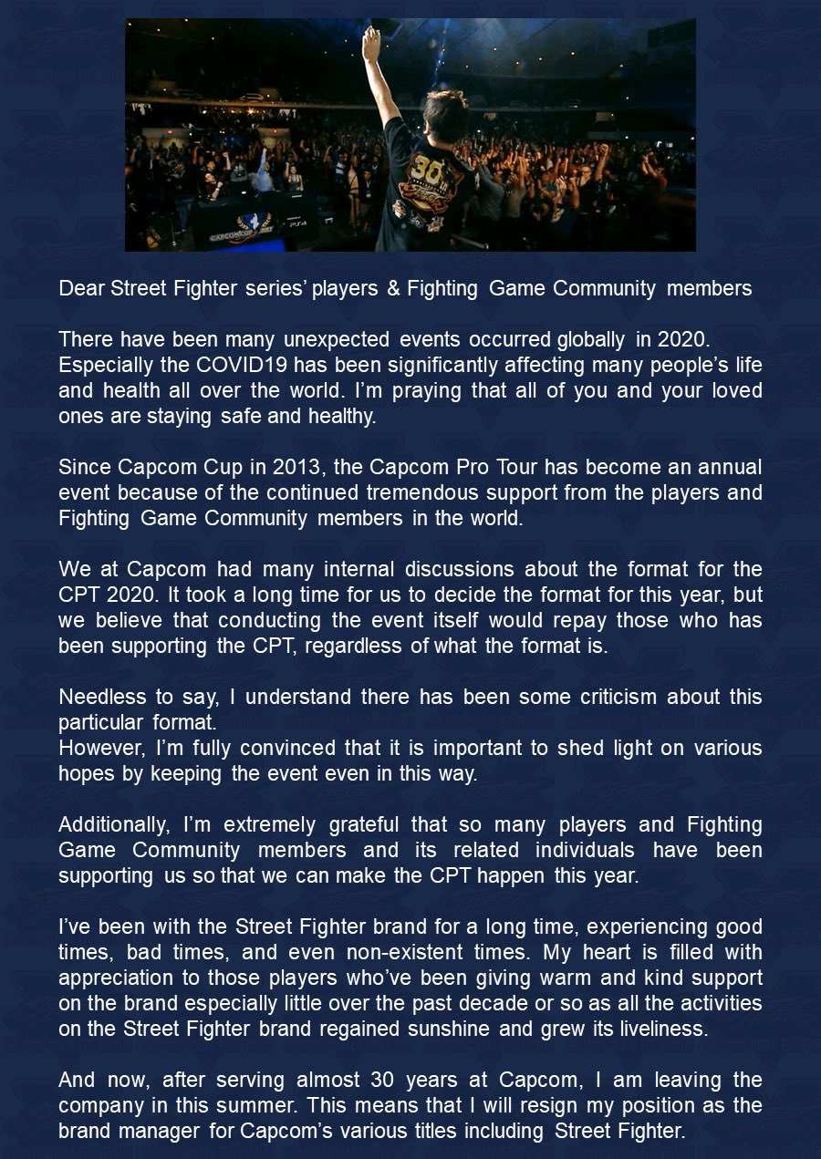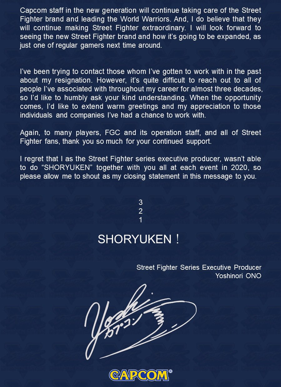日本著名游戏制作人及《街头霸王》系列制作人小野义德先生今日宣布从卡普空离职。 他通过个人官推以告别信的方式宣布了此消息。