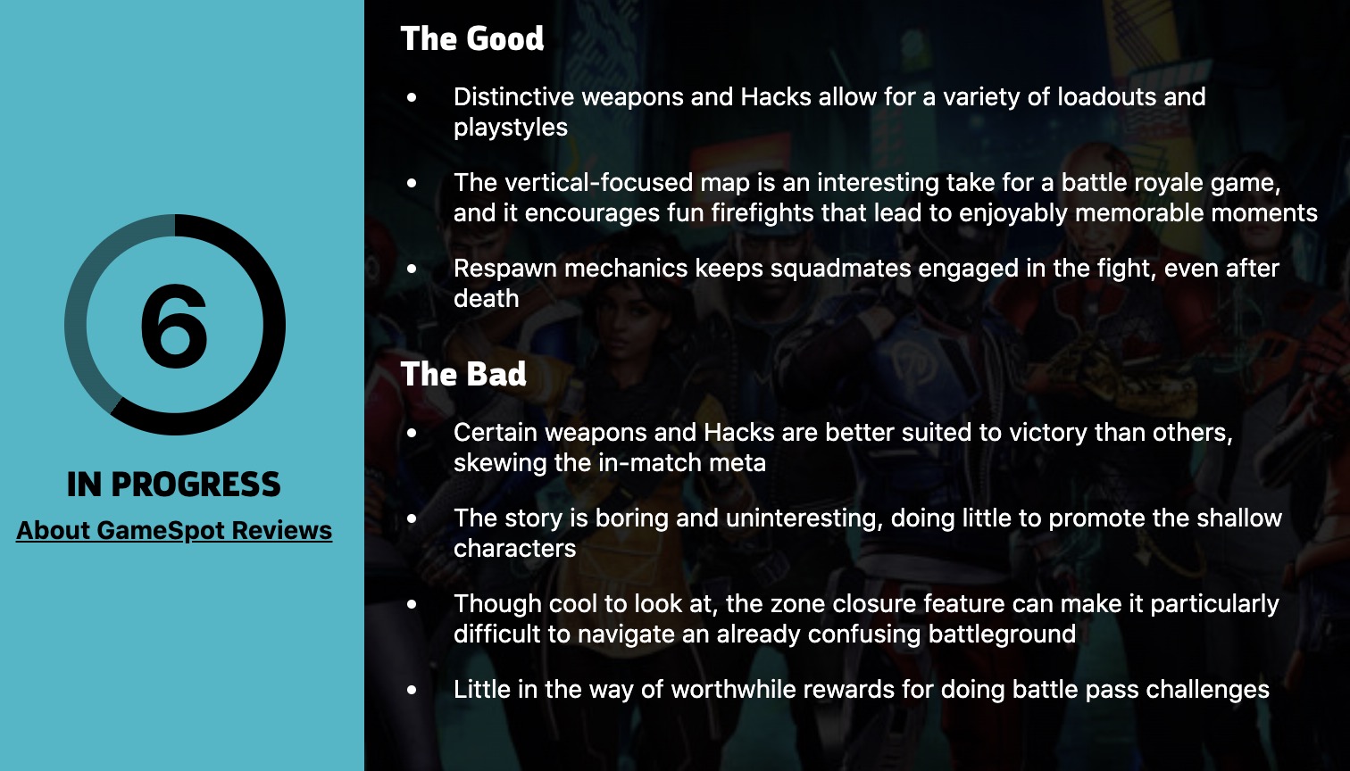 【育碧“吃鸡”游戏《超猎都市》Gamespot先行评测6分】Gamespot今日为此前正式上线的育碧旗下“吃鸡”游戏《超猎都市》打出了6分的先行评价。Gamespot认为,《超猎都市》有着别具一格的武器和黑客功能,可以实现多种玩法和游戏风格;聚焦于垂直面的地图设计在战术游戏中非常有趣,交火过程很有意思,给人留下深刻印象;重生机制使你即使死亡后也有机会继续战斗。缺点是,一些武器的数据和机制看起来过于强大,破坏游戏平衡;背景故事也很无趣;区域关闭功能让战场看起来十分混乱,让人找不着北;战斗通行证获得的回报也很有限。