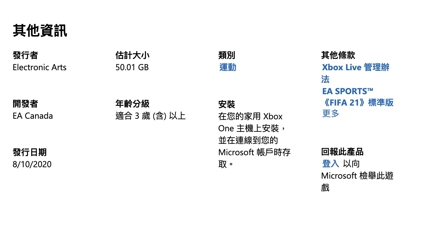 微软商店显示《FIFA 21》游戏容量约50GB,与《FIFA 20》基本相同