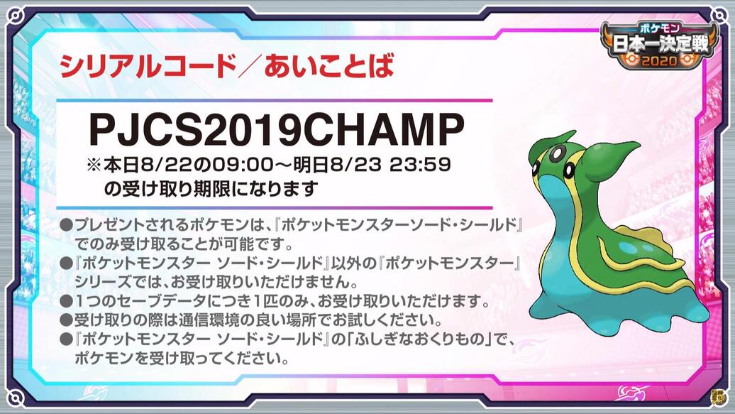 【官方派送!宝可梦官方现已派送职业选手成品海兔兽】《宝可梦》官方又一次开启了《宝可梦 剑/盾》成品宝可梦的派送活动。这次派送的是2019年世界锦标赛亚军Kimura Hirofumi的海兔兽。在游戏的“神秘礼物”中输入代码“PJCS2019CHAMP”即可领取。该只海兔兽的个体为4v0速,特性引水,努力值为148HP、92物防、252特攻、12特防。经常玩双打对战的玩家可以进行领取。领取时间截止至北京时间8月23日22:59分。