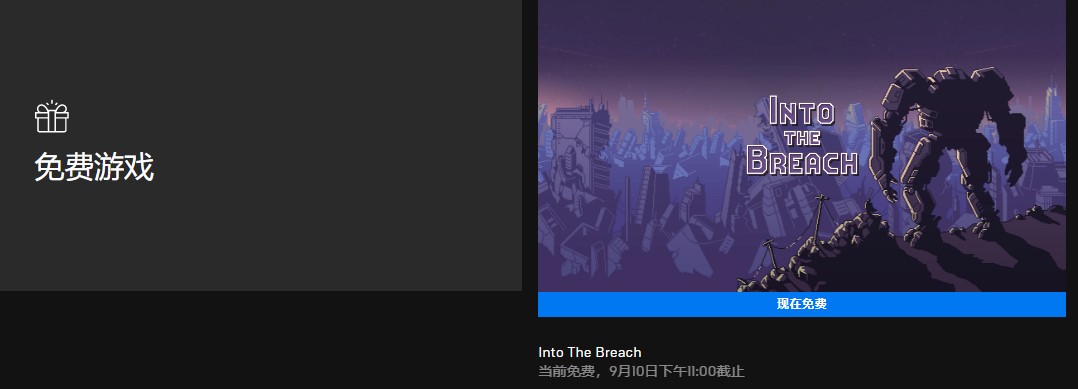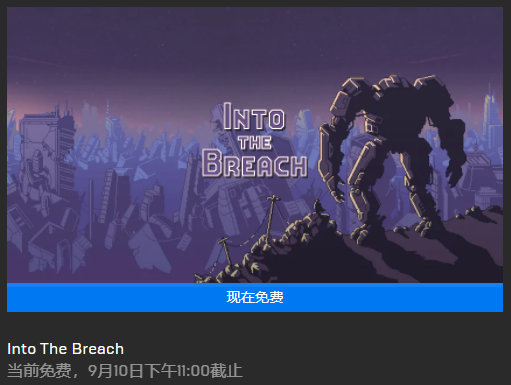 【Epic喜+1:《陷阵之志》免费领】本周的Epic免费游戏是备受好评的战棋游戏《Into The Breach - 陷阵之志》,领后永久入库。下一周免费游戏是模拟经营游戏《Railway Empire - 铁路帝国》以及互动小说《Where the Water Tastes Like Wine - 彼处水如酒》,9月10日开启领取。