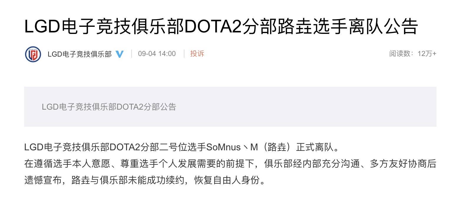 【LGD《DOTA2》二号位选手Maybe宣布离队】LGD电子竞技俱乐部官方宣布,旗下《DOTA2》分部二号位选手“Maybe”路垚将不会与俱乐部续约,将恢复自由人的身份。Maybe自出道起就被誉为CNDOTA最出色的二号位选手之一,擅长影魔、船长、蓝猫等英雄。在2018年,他帮助LGD接连拿到震中杯和MDL长沙Major冠军,并拿到Ti8的亚军。