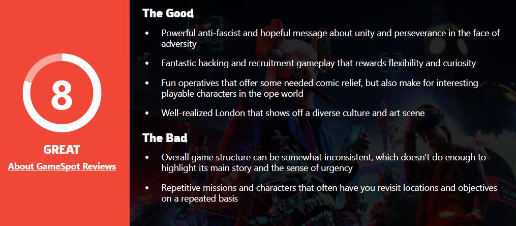 GameSpot认为游戏的优点在于:游戏传达了强烈的反抗强权和充满希望的信息,在逆境中团结一致,坚韧不拔。奇妙的黑客和招募玩法带来了很强的灵活性,同时也让玩家们保持好奇心。一些有趣的探员为游戏增添了幽默和活力。充分还原的伦敦都市展现了它的文化多样性和艺术景观。缺点则有:游戏的整体结构有些不一致,不足以突出主线故事和剧情紧迫感。存在一些重复的任务和角色,经常让你反复访问同一个地点,执行同样的任务。