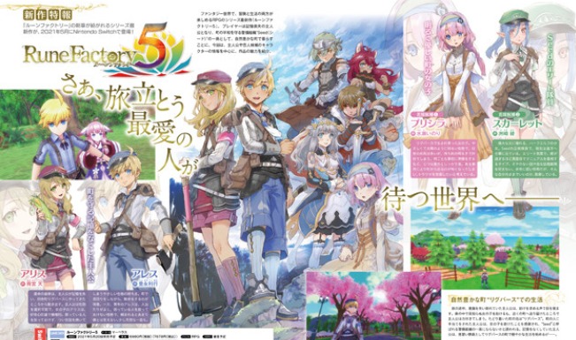 【《符文工房5》主角和恋人候选等角色信息介绍】近日Fami通在最新一期杂志上介绍了《符文工房5》的最新信息,《符文工房5》为该系列最新作,是一款在一个剑与魔法的幻想世界里展开冒险的人气RPG游戏。本作主人公依旧可以选择性别,女性角色名为“爱丽丝”男性角色为“艾雷斯”,冒险的据点是一个充满大自然风光的小镇“利谷巴斯”。主人公作为维护小镇和平的警卫队“Seed”的一员,在这里生活。此外还公布了几位玩家们最为期待的新娘候选(普里西拉,斯卡雷特,露西)以及新郎候选(马丁,莱因哈特,塞西尔),游戏中可以与候补对象恋爱并结婚生子。本作在战斗中可以使用各种各样的武器以及魔法,并可以和同伴配合使用帅气的连携技。传统的种地和钓鱼等老系统也保留,一应俱全。《符文工房5》将于2021年5月20日登录NS平台。