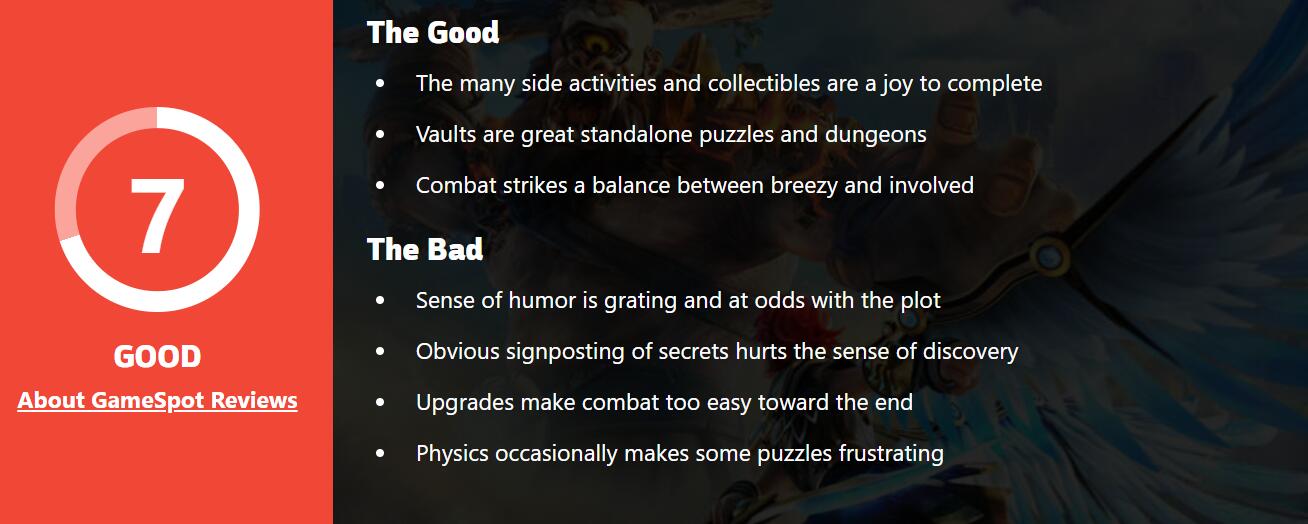 GameSpot认为:游戏的支线和收藏品可使玩家玩的时候非常入迷,墓穴的解谜部分也很出彩,并且本作在轻松愉悦的氛围下把和紧张战斗之间的平衡处理得非常好。但是诙谐的幽默却与故事剧情有些格格不入,明显的路标等提示也严重破坏了探索的乐趣。升级系统让游戏后期的战斗太过简单乏味以及本作许多解谜部分实在有些令人不满意。
