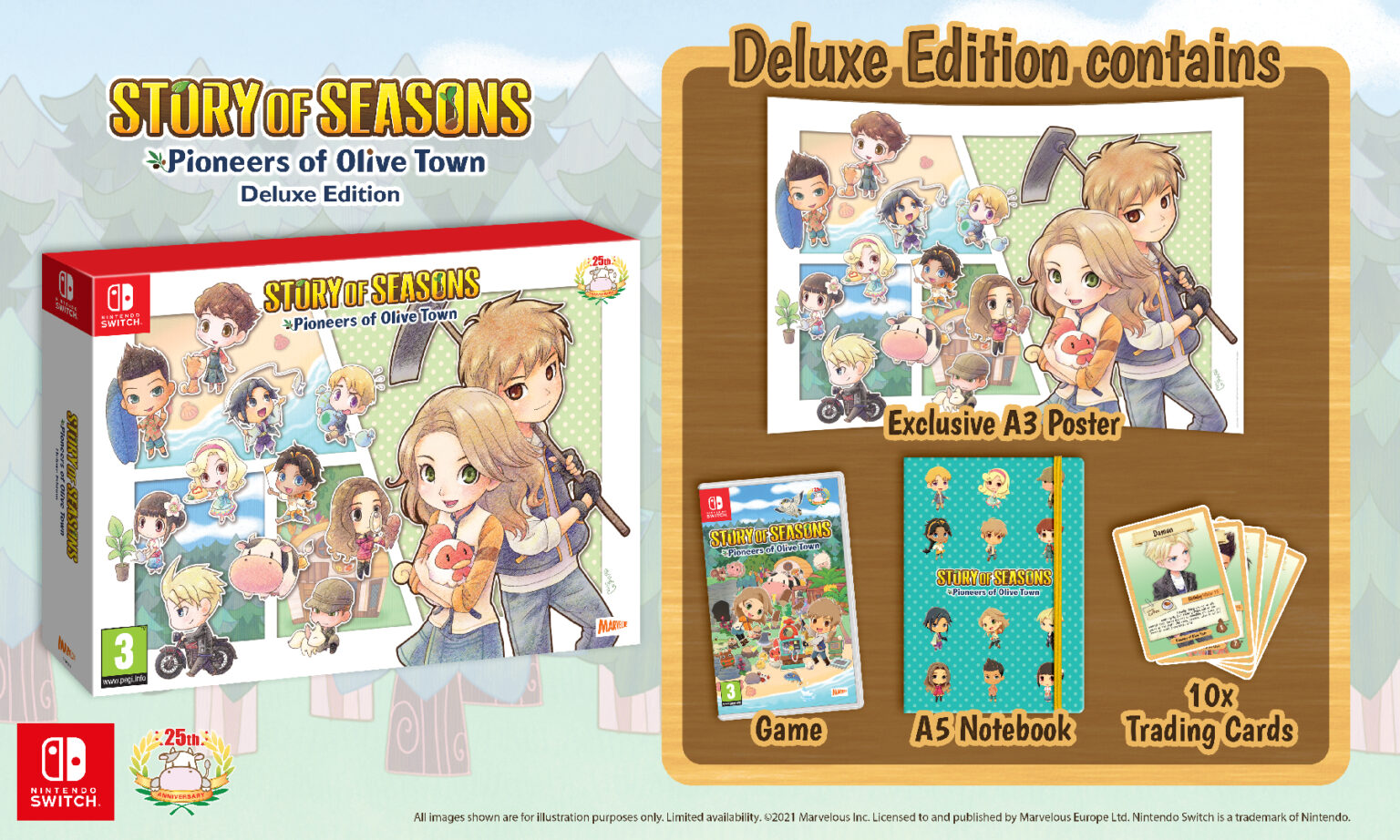 【《牧场物语:橄榄镇与希望的大地》欧美实体限定版内容公布】Marvelous公布了《牧场物语:橄榄镇与希望的大地》欧美实体限定版内容。限定版售价59.99美元/欧元,除了实体游戏外,美版还包含水牛公仔、游戏海报;欧版包含一个A5大小主题笔记本、10张游戏角色卡牌、以及一张A3大小游戏海报。《牧场物语:橄榄镇与希望的大地》将于2021年2月25日登陆Switch平台(中文版同步发售),欧美版则将于3月23日发售。