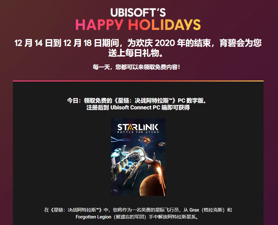 育碧官方昨日宣布,为欢庆2020年的结束,在12月14日~12月18日期间,将会每日送上免费内容。 今日领取内容:《星链:阿特拉斯之战》完整数字PC游戏。