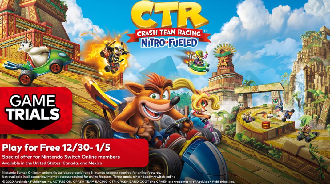 【Switch Online会员免费游玩《古惑狼大进击赛车 氮气爆动》活动现已开启】任天堂eShop US/EU商店Switch Online会员限时免费游玩《古惑狼大进击赛车 氮气爆动》活动现已开始,参与方法与此前一样,玩家进入游戏的商店页面即可点击下载试玩版。活动时间为即日起~1月5日下午16点。