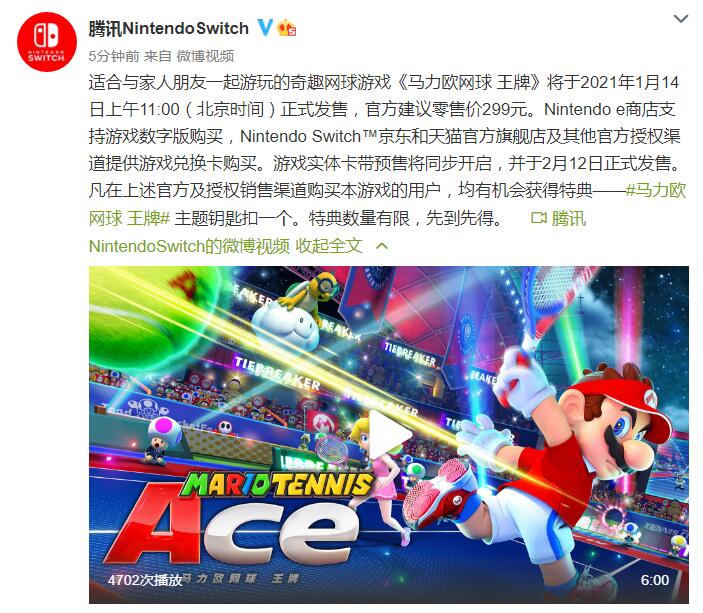 【国行版《马力欧网球 王牌》数字/实体版将于1月14日/2月12日发售,售价299元】国行Switch游戏《马力欧网球 王牌》数字版确认将于1月14日上午11点发售,实体版预售将同步开启,并于2月12日正式发售,游戏售价为299元。