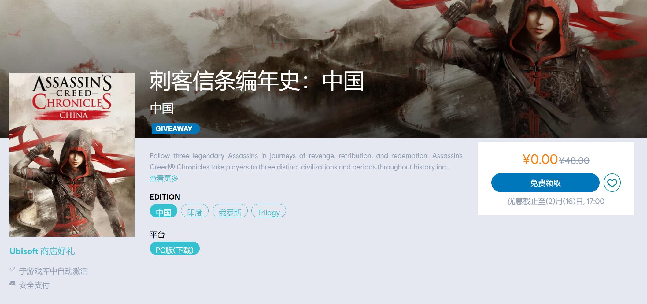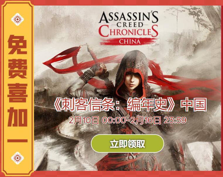 育碧商城喜加一《刺客信条编年史:中国》现已开放免费领取
