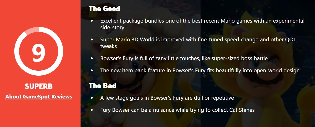 GameSpot认为:优点方面,本作很出色将马力欧与实验性的游戏相结合、“超级马力欧3D世界”通过一些细节上的微调得到了改进、“库巴之怒”优秀的超大型Boss战、“库巴之怒”新物品库功能非常适合开放世界设计;缺点方面,“库巴之怒”的一些阶段目标乏味或重复度过高、收集猫咪时的体验会令人厌烦。