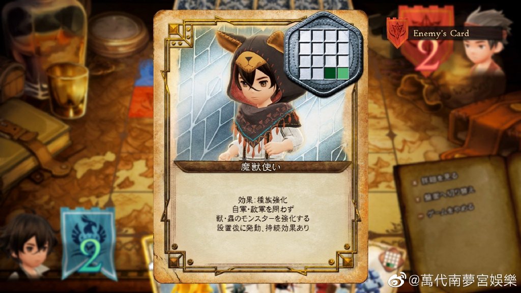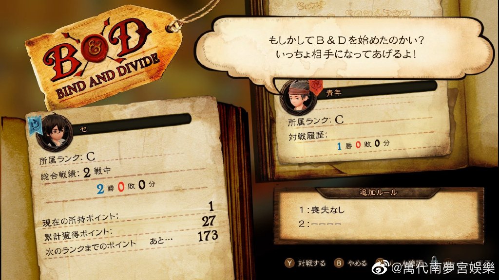 【《勇气默示录2》小游戏“驳斗卡”情报公开】在《勇气默示录2》中,除了寻找四个水晶的主线剧情,还有许多支线任务以及独创的特色小游戏。万代南梦宫今日带来了小游戏“驳斗卡”的介绍。驳斗卡是亚克希兰特大陆非常风行的卡片游戏,可用六张卡自由组成自己的卡组,卡片种类包含能占领地的“怪物卡”,以及拥有特殊效果的“职业卡”和“角色卡”。规则也十分简单,两位玩家要轮通过六张卡,最后占有比较多领地的人胜利。Switch《勇气默示录2》(官译《勇敢的默认2》) 中文版将于2月26日推出。