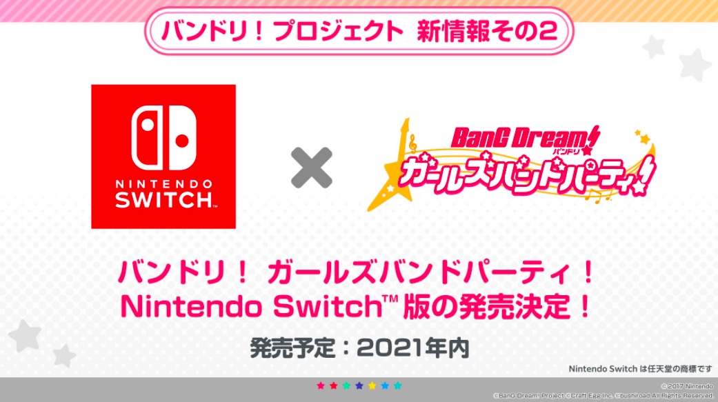 【少女音游《BanG Dream! 少女乐团派对》2021年登陆Switch】少女音游《BanG Dream! 少女乐团派对》宣布登陆Switch平台,将于2021年内推出。本作此前已经登陆手机平台,Switch版的内容和玩法是否会有改变暂时不明,官方将会在日后公布更多情报。