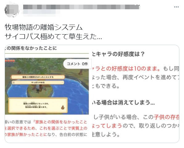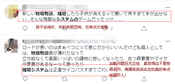 【《牧场物语》新作差评风波不断,“离婚系统”引玩家热议】《牧场物语》系列最新作《牧场物语:橄榄镇与希望的大地》推出后,因其取消立绘,加载过长且频繁等问题一度遭到众多玩家的吐槽,近日随着玩家已经将游戏推到中后期,类似“离婚”系统又再一次将本作推上舆论舞台。本作中,祠堂精灵成长成大人后(需发现100只可乐彭以上,发生事件)就会有特别祈愿这一选项出来。选择这个恩惠后将解除家庭关系,实质上类似“离婚”会回到告白前的状态。可以再一次向同一人或其他人告白并结婚,之前两人的孩子将会消失。本作在发售时除了普通版以外,还带有附带季票的版本,季票会分四次更新,内容为新服装以及前作可攻略角色(男女各两名),或许处于几个月后推出更新时,考虑到避免玩家想攻略新角色还需重新开档的麻烦……许多日本玩家表示,《牧场物语》系列中加入离婚系统,温馨画面下这样冷酷无情的抉择让人有些无法接受。此前利用存档就已经可以攻略多人,孩子消失听起来不仅恐怖还有点残酷。顺便一提,作为本作制作人及美食家的武村大或许也是游戏风评问题,最近也删除了自己社交平台帐号上关于《牧场物语:橄榄镇与希望的大地》内容,以及个人担任这款游戏制作人的简介。