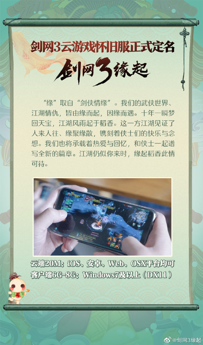 《剑网3》云游戏怀旧服正式定名为《剑网3缘起》,封测信息将于3月11日公布。目前据官方介绍,《剑网3缘起》云端容量为20M,支持iOS/安卓/Web/OSX平台;客户端6G~8G,支持Windows7及以上(DX11)。