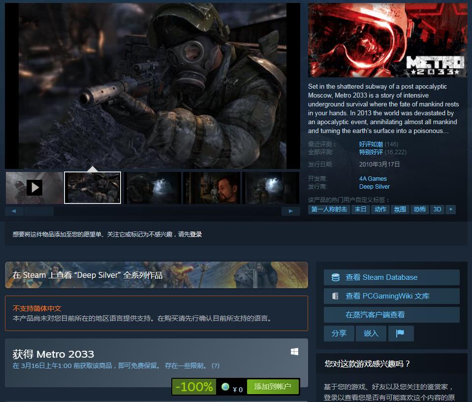 Steam喜加一:《地铁 2033》免费领,系列全线折扣中