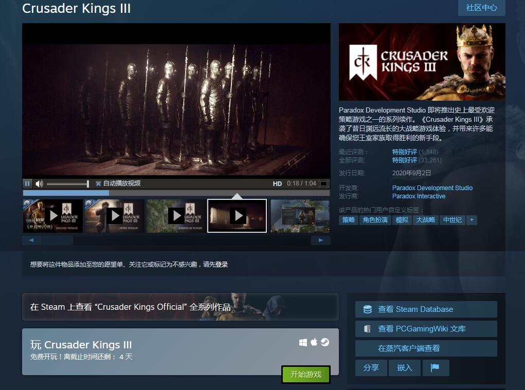 【《十字军之王3》限时免费游玩,8折特惠进行中】Steam上的《十字军之王3》目前正在开启限时免费游玩,截止至3月22日玩家都可以免费体验这款游戏。而此外,活动期间游戏也开启了8折特惠,折扣价110元。