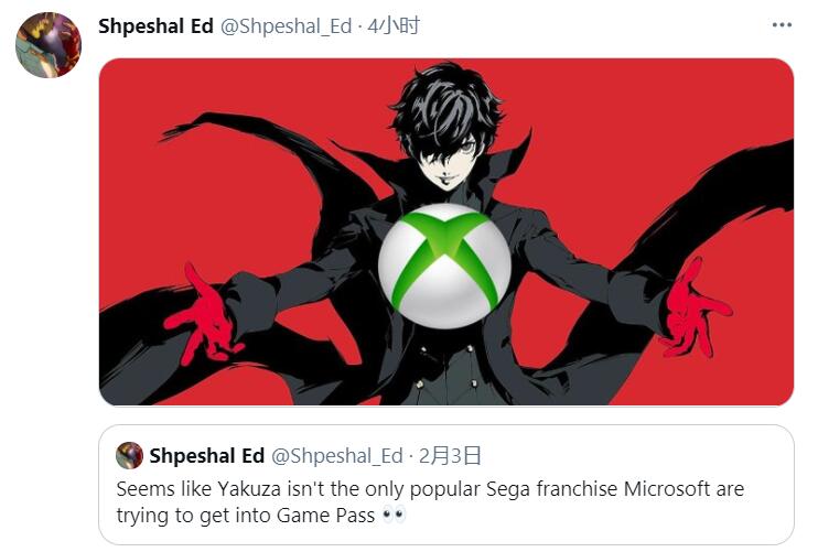 【传闻《女神异闻录5》或即将加入XGP?!】又是一个关于XGP的爆料,这次的爆料来源同样是Shpeshal Ed,此人以往不仅多次爆料Game Pass新闻,还在近期准确爆料了《最终幻想7 重制版》加入PS+会免。事情的出处是这样的,首先Shpeshal Ed在2月3日表示“除了《人中之龙》之外,微软还在试图将SEGA另一款高人气游戏带入XGP”,然后就在刚才Shpeshal Ed发布了一张《女神异闻录5》和Xbox图标的图片。由于今天微软突然宣布将《传说之下》和《八方旅人》这两款此前没有Xbox One版的游戏加入XGP,所以Shpeshal Ed的这次爆料也在海外玩家中引起了热烈讨论!
